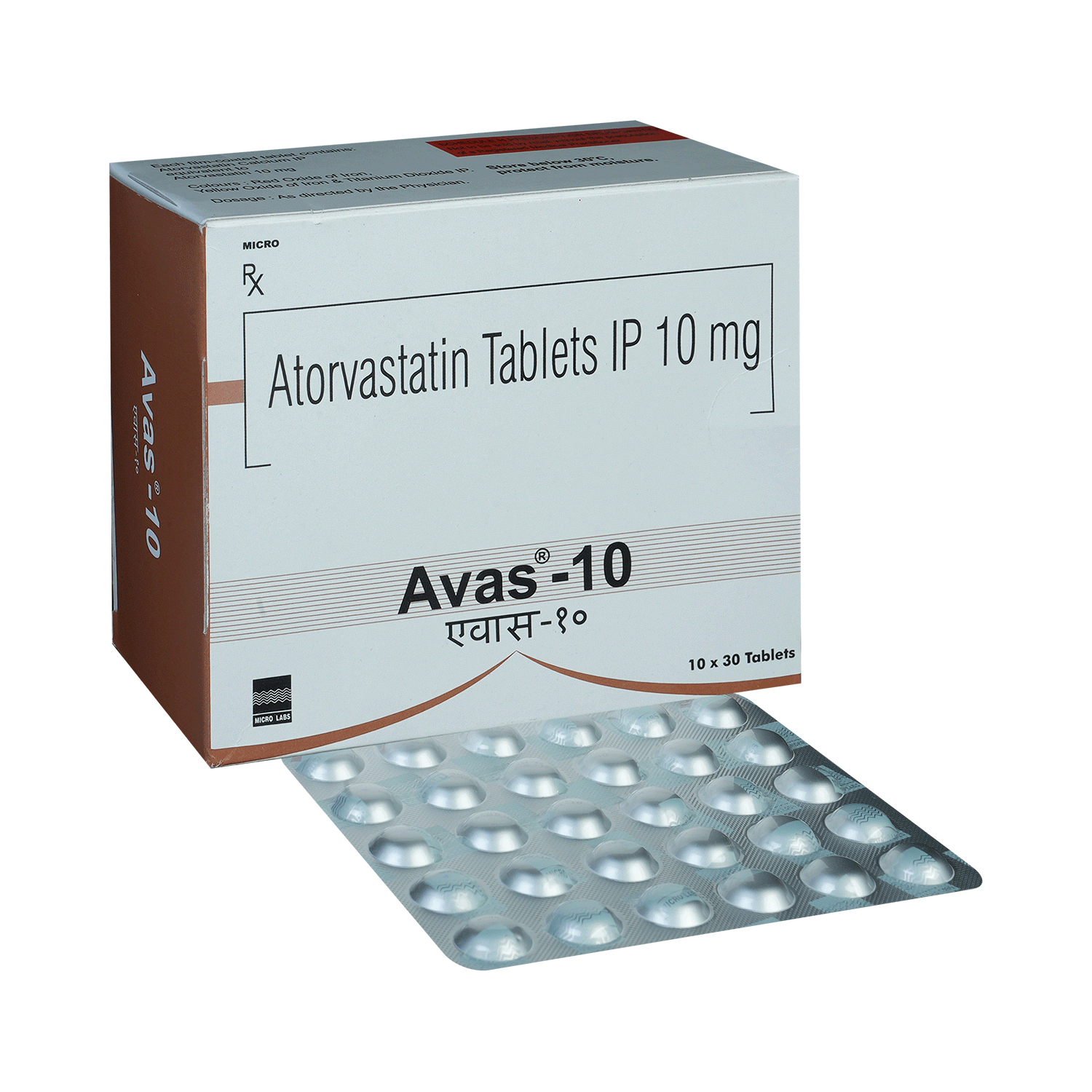 Avas 10mg Tab (Atorvastatin) is a medication used to lower cholesterol levels. It works by blocking the production of cholesterol in the liver. It is important to take this medication exactly as prescribed by your doctor. Common side effects include muscle pain and weakness, headache, indigestion, constipation, diarrhea, and rash. If you experience any side effects, contact your doctor immediately. Avoid excessive alcohol consumption, and do not drive or operate machinery until you know how this medication affects you. Atorvastatin is not recommended for pregnant or breastfeeding women, and it is not usually prescribed for children. If you have kidney or liver problems, your doctor may need to monitor you closely.