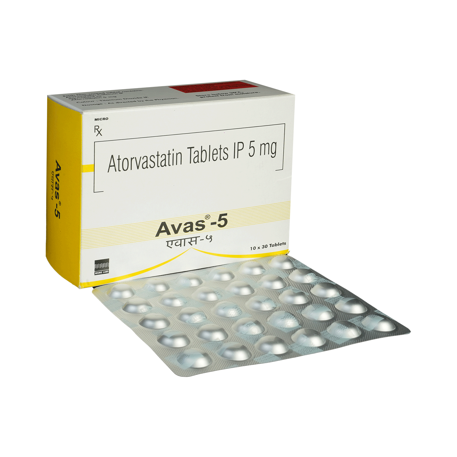 Avas 5mg Tab (Atorvastatin) is a medication used to lower cholesterol levels in the blood. It can help reduce the risk of heart attack, stroke, and other heart-related problems. This medication is usually taken once a day, with or without food. It is crucial to follow your doctor's instructions carefully and report any unusual side effects. If you have any questions or concerns, please consult your doctor.