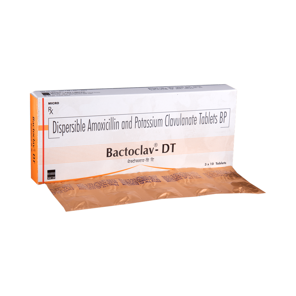 Bactoclav Dt Tab (Amoxicillin + Clavulanic Acid) is a combination antibiotic used to treat various bacterial infections. It's crucial to follow your doctor's prescribed dosage and complete the entire course of treatment. Common side effects include nausea, diarrhea, and rash. Inform your doctor about any pre-existing medical conditions, especially kidney or liver problems, and if you're pregnant, breastfeeding, or consuming alcohol. Seek immediate medical attention for any signs of a severe allergic reaction.