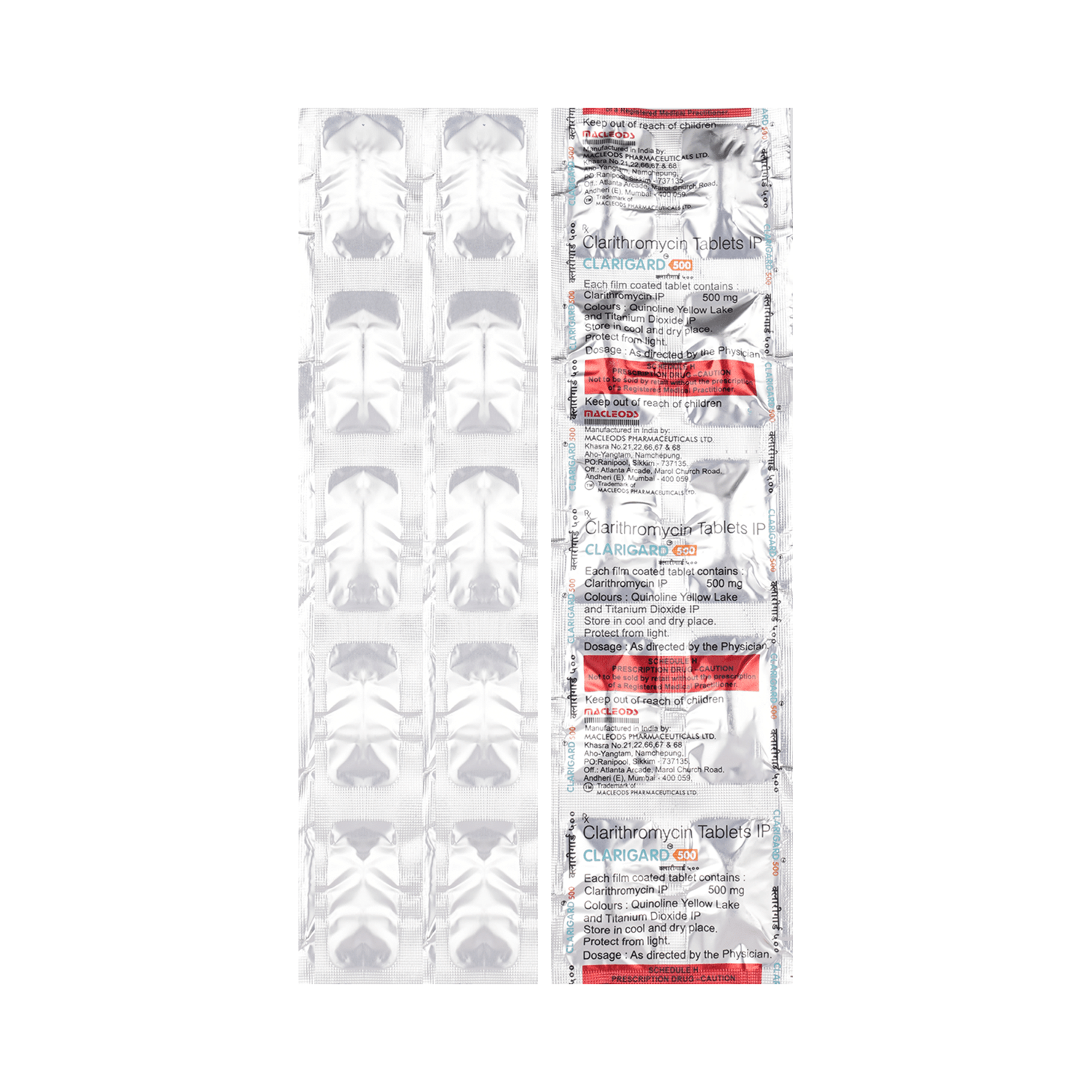 Clarigard 500mg Tab (Clarithromycin) is an antibiotic used to treat various bacterial infections. It's crucial to follow your doctor's prescription instructions precisely regarding dosage and duration. Common side effects include nausea and diarrhea. Inform your doctor about any pre-existing health conditions, especially liver or kidney problems, and if you are pregnant, breastfeeding, or consume alcohol. Never stop taking the medication without consulting your doctor.