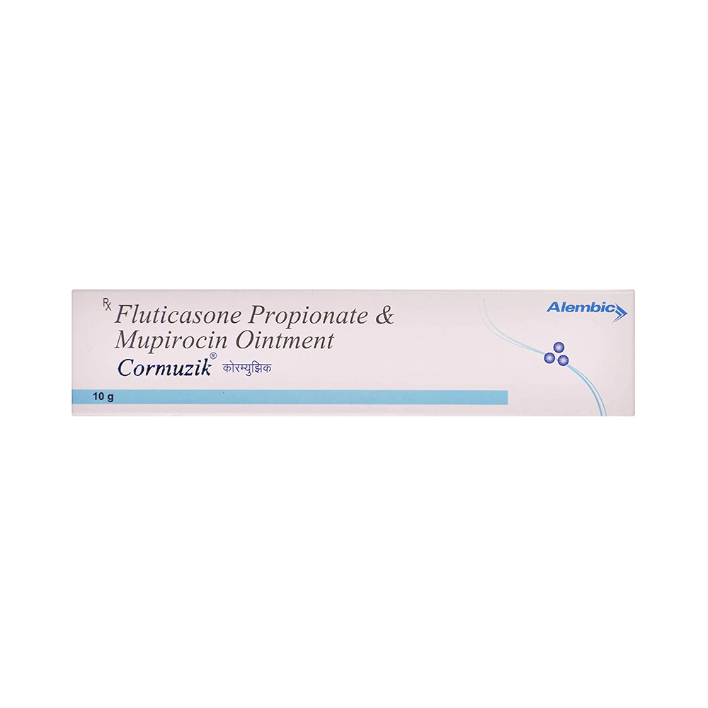 Cormuzik Oint 10gm (Fluticasone Propionate + Mupirocin) is a combination medication used to treat bacterial skin infections. It works by reducing inflammation and fighting bacteria. Apply a thin layer of the medication to the affected area two to three times daily. Common side effects include burning, stinging, or redness at the application site. It is important to avoid using this medication during pregnancy or breastfeeding unless your doctor advises it. Always store the medication at room temperature, away from moisture and heat. Keep it out of reach of children.