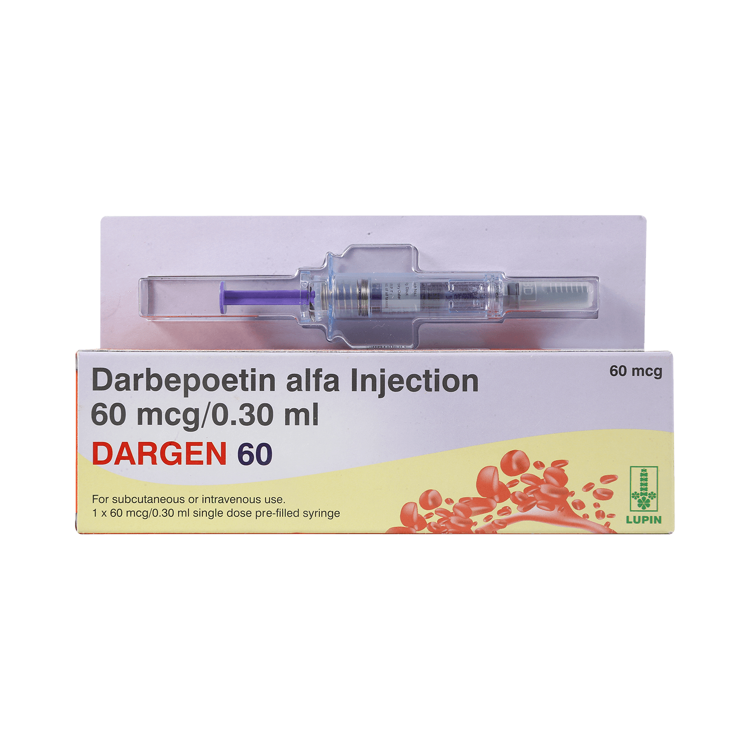 Dargen 60mcg Inj (Darbepoetin Alfa) is a medication that stimulates the production of red blood cells. It is used to treat anemia associated with chronic kidney disease, chemotherapy for cancer, and HIV/AIDS. The dosage and frequency of administration are determined by your doctor based on your individual needs. Common side effects include headache, high blood pressure, and flu-like symptoms. It is important to follow your doctor's instructions carefully and report any side effects you experience.