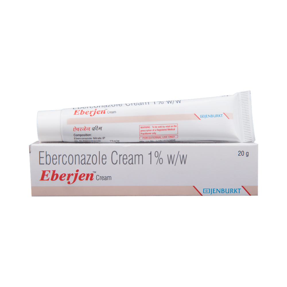 Eberjen Cream 20gm (Eberconazole) is an antifungal medication used to treat various fungal infections, including skin, nail, and vaginal infections. It works by inhibiting the growth of fungi, disrupting their cell membrane and preventing them from multiplying. The medication is available in different formulations, such as topical creams, lotions, and oral capsules. The dosage and administration depend on the type of infection and the formulation. It's crucial to follow your doctor's instructions carefully and not exceed the recommended dosage. While eberconazole is generally safe, it can cause side effects, although most are mild. It's essential to inform your doctor about any existing medical conditions, especially if you have kidney or liver problems, are pregnant, breastfeeding, or taking other medications. Always discuss any concerns or questions you have with your doctor or pharmacist.