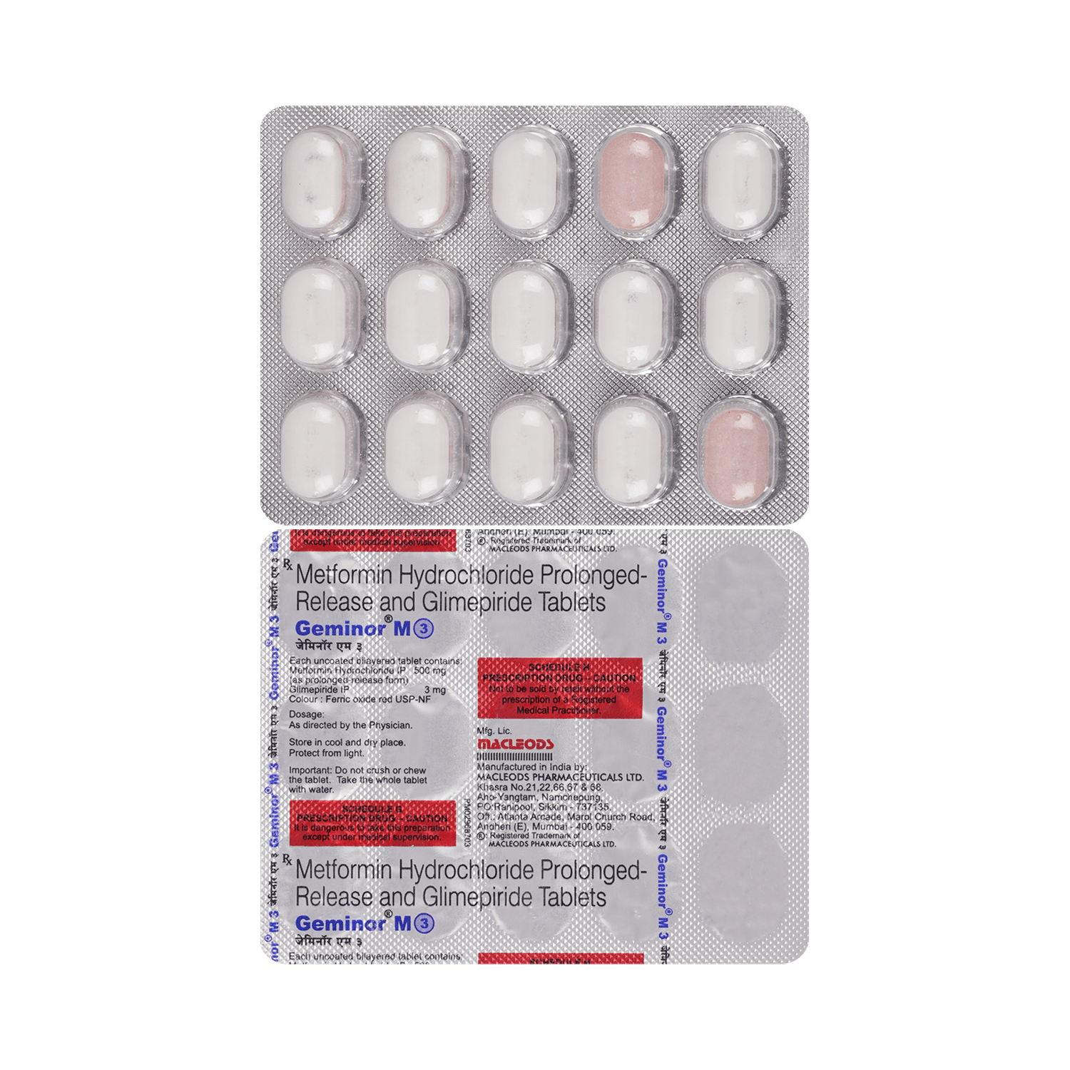 Geminor M 3 Tab (Glimepiride + Metformin) are medications used to control blood sugar levels in patients with type 2 diabetes. They work by increasing insulin production and reducing glucose production in the liver. This combination is generally well-tolerated, but common side effects include hypoglycemia, gastrointestinal problems, and skin rash. It's crucial to follow your doctor's instructions regarding dosage and to be aware of potential interactions with alcohol and other medications. Regular blood sugar monitoring and close communication with your healthcare provider are essential for safe and effective treatment.