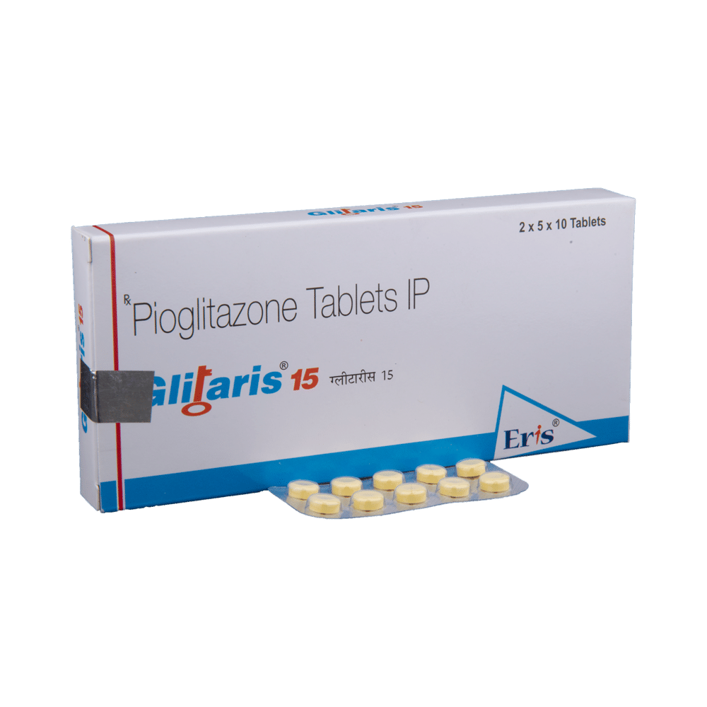 Glitaris 15mg Tab (Pioglitazone) is a medication used to improve blood sugar control in adults with type 2 diabetes. It works by increasing the body's sensitivity to insulin. However, it has potential side effects such as fluid retention, weight gain, and increased risk of bone fractures and heart failure. It’s crucial to discuss this medication with your doctor to assess if it’s suitable for you and to monitor for potential side effects. Always follow your doctor’s prescribed dosage and instructions.