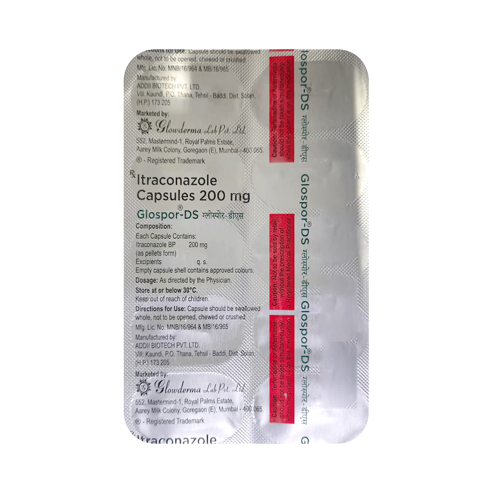 Glospor Ds 200mg Cap (Itraconazole) is an antifungal medication used to treat various fungal infections. Dosage and duration of treatment vary depending on the infection. Common side effects include headache, nausea, and digestive issues. It's crucial to follow your doctor's instructions carefully, avoid alcohol, and report any unusual symptoms immediately.