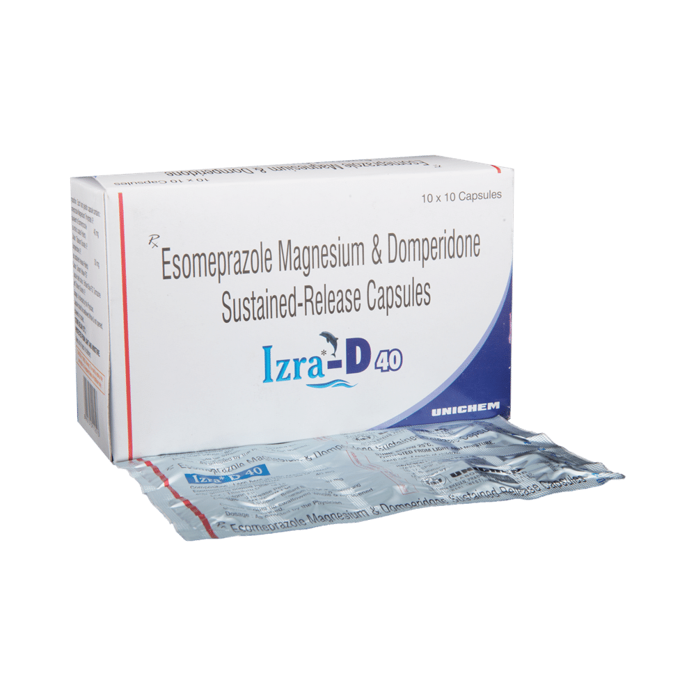 Izra D 40mg Cap (Domperidone + Esomeprazole) is a combination medication used to treat GERD and related conditions by increasing stomach emptying and reducing acid production. It's crucial to follow your doctor's instructions on dosage and be aware of potential side effects. Consult your doctor if you experience any adverse reactions or have underlying health conditions.