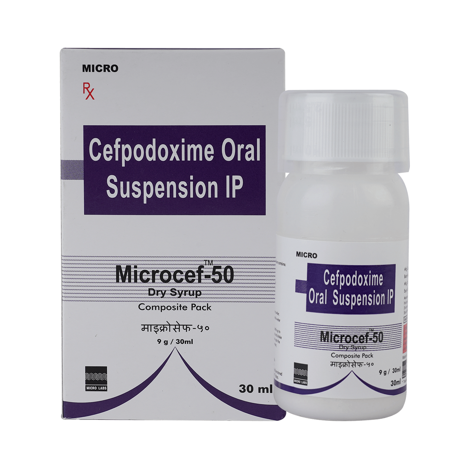 Microcef 50mg Dry Syp (Cefpodoxime) is an antibiotic used to treat various bacterial infections. It works by killing bacteria that cause infections. It is usually taken by mouth, with or without food. Common side effects include diarrhea, nausea, vomiting, stomach pain, headache, dizziness, and rash. If you have any questions or concerns, talk to your doctor.