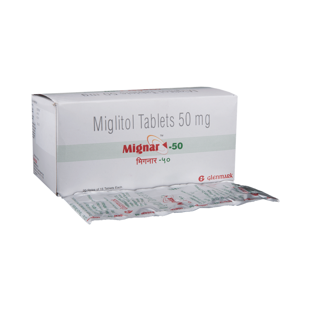 Mignar 50mg Tab (Miglitol) is a medication used to manage type 2 diabetes. It works by slowing down the absorption of carbohydrates, helping to control blood sugar levels. Common side effects include gastrointestinal issues. It's crucial to follow your doctor's instructions on dosage and to discuss potential interactions with other medications or conditions, especially kidney or liver disease. Always inform your doctor if you are pregnant, breastfeeding, or planning to become pregnant.