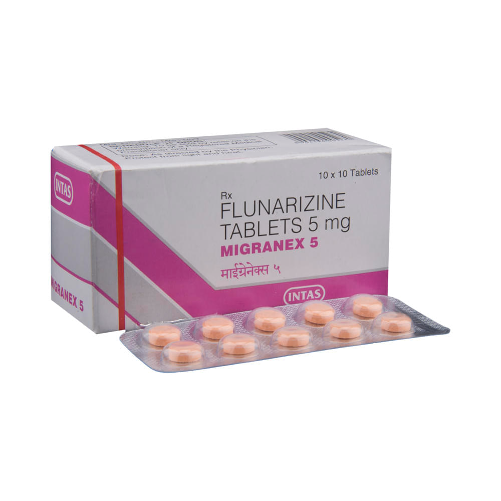 Migranex 5mg Tab (Flunarizine) is a medication used to prevent migraine headaches and treat vertigo. It works by affecting calcium channels in the brain and inner ear. Common side effects include drowsiness and weight gain. It's crucial to inform your doctor about other medications you are taking, any pre-existing medical conditions (especially kidney or liver issues), and if you are pregnant, breastfeeding, or planning to become pregnant. Never self-medicate; always follow your doctor's instructions regarding dosage and duration of treatment. Alcohol consumption and operating machinery should be approached cautiously while taking this medication.