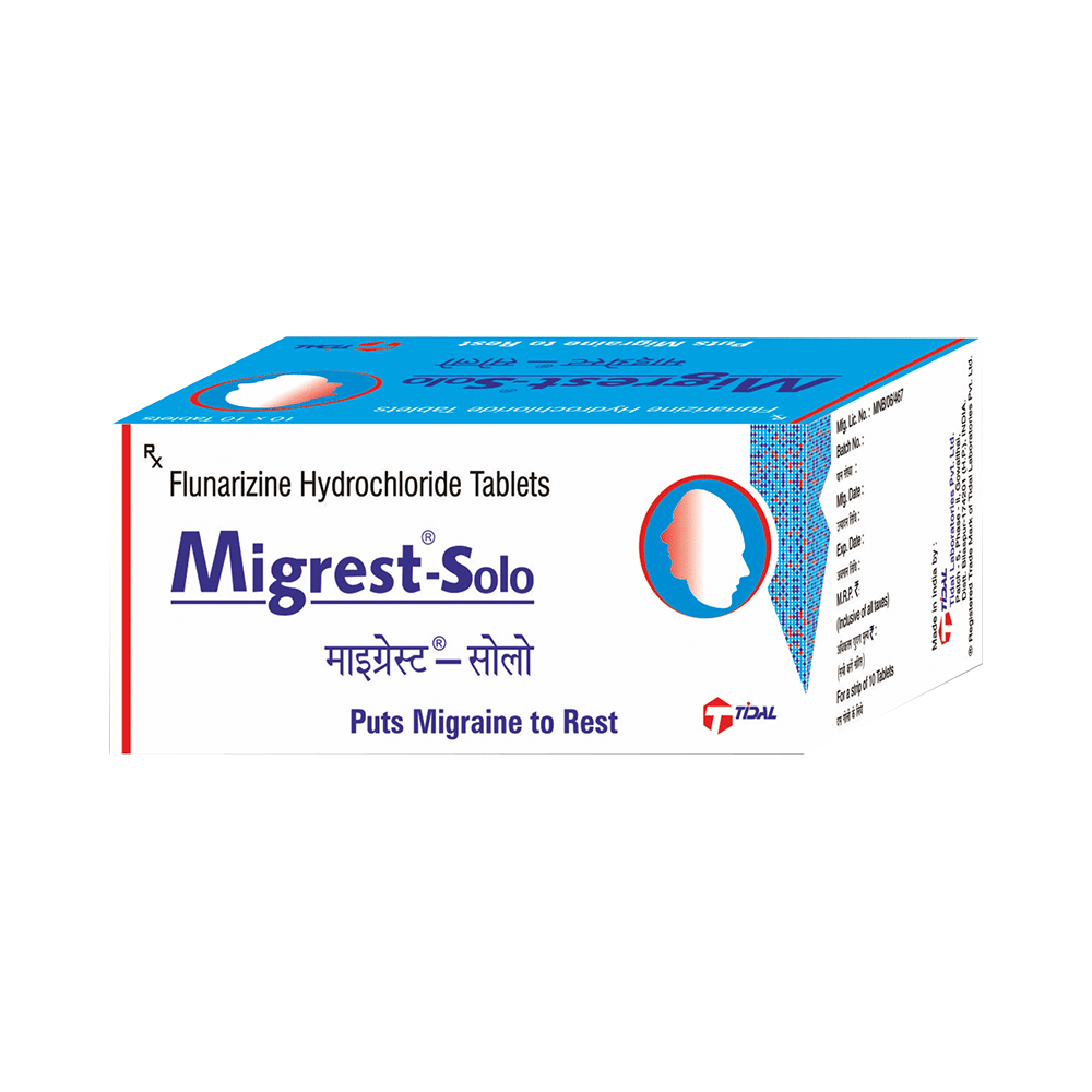 Migrest Solo Tab (Flunarizine) is a medication used to prevent migraines and treat Meniere's disease. It works by blocking calcium channels in the brain and inner ear. Common side effects include drowsiness, weight gain, and fatigue. Flunarizine can interact with other medications and alcohol, so it's important to talk to your doctor about any other medications you are taking. It's also important to be careful when driving or operating machinery, as Flunarizine can cause drowsiness. Flunarizine is not recommended for use during pregnancy or breastfeeding, and its safety in children has not been established. It's important to follow your doctor's instructions carefully and to report any side effects to them.