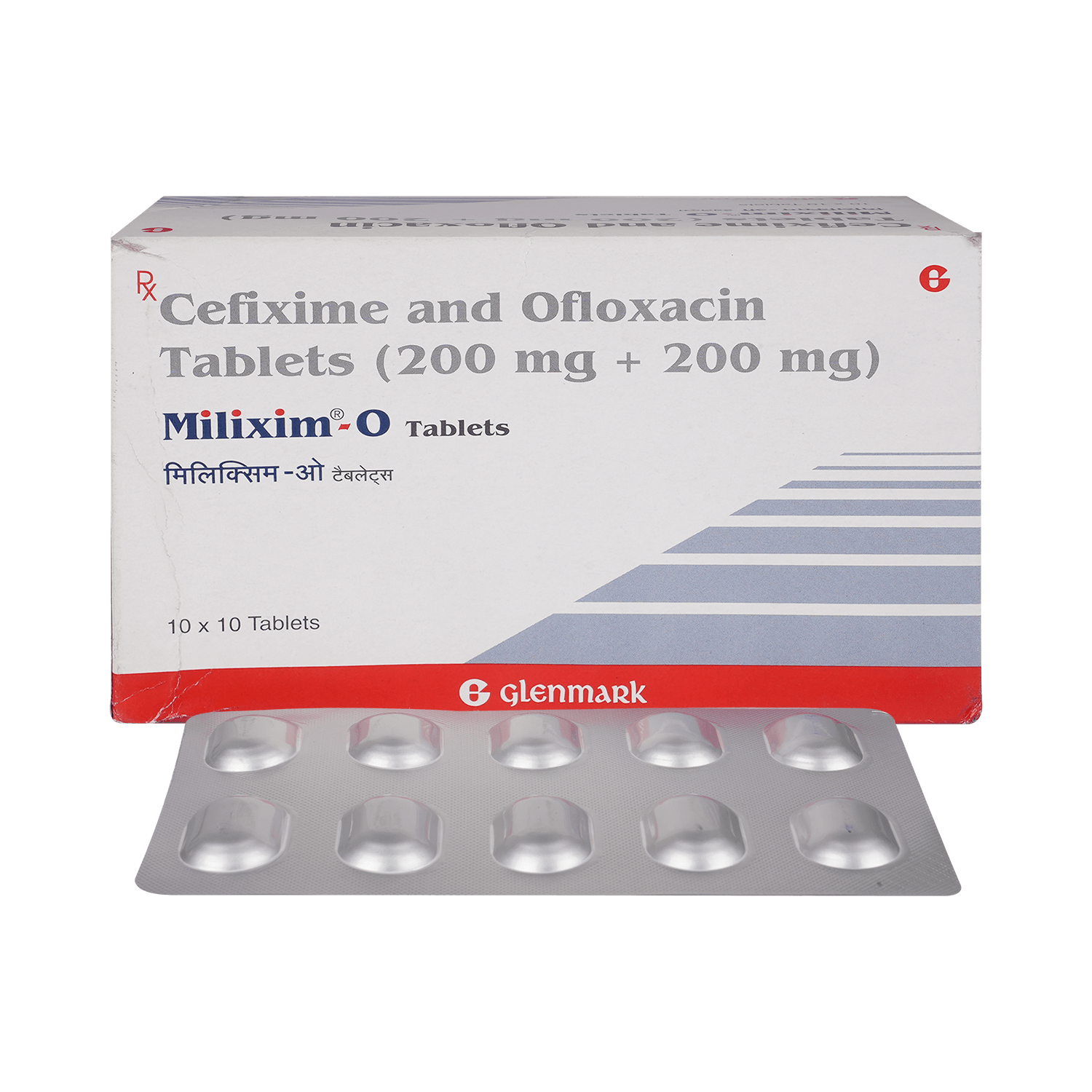 Milixim O Tab (Cefixime + Ofloxacin) is a combination antibiotic used to treat bacterial infections. It is important to take this medicine as directed by your doctor. Do not stop taking the medicine early, even if you start to feel better. This medicine may cause side effects, including diarrhea, nausea, vomiting, and headache. Avoid alcohol and operating machinery while taking this medicine. If you are pregnant, breastfeeding, or have any health conditions, talk to your doctor before taking this medicine.