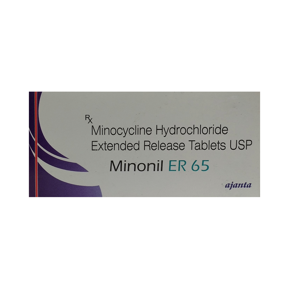 Minonil Er 65mg Tab (Minocycline) is a tetracycline antibiotic used to treat various bacterial infections. It works by stopping bacterial growth. Common side effects include nausea, vomiting, and diarrhea. Serious side effects are rare but possible. Always follow your doctor's instructions carefully, and inform them about any pre-existing medical conditions or medications you are taking. Do not take minocycline if you are allergic to tetracyclines.