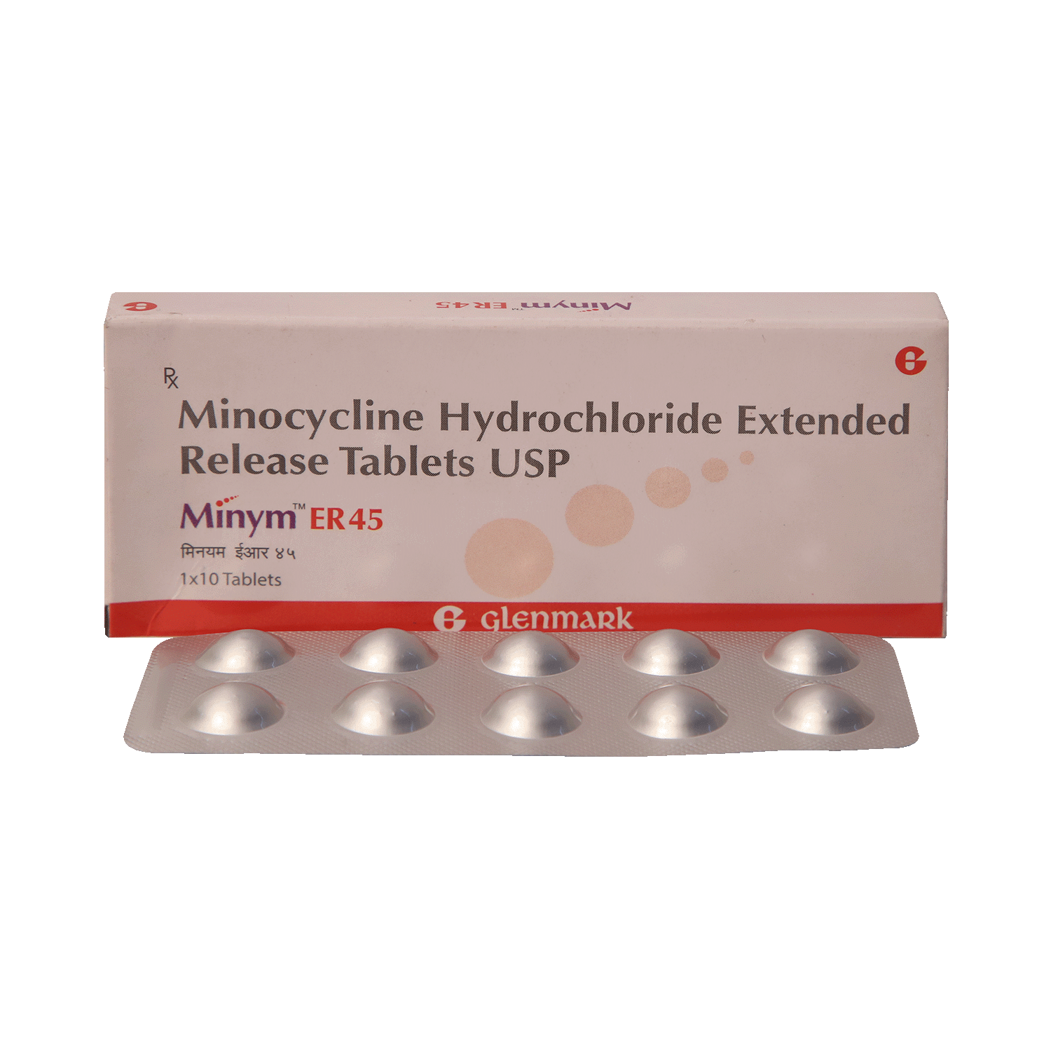 Minym Er 45mg Tab (Minocycline) is an antibiotic that fights bacteria. It is used to treat a variety of infections, including acne, pneumonia, bronchitis, urinary tract infections, Lyme disease, and anthrax. It is important to take minocycline exactly as prescribed by your doctor. Do not skip doses or stop taking the medication early, even if you feel better. Minocycline can cause side effects, including nausea, vomiting, diarrhea, and dizziness. If you experience any serious side effects, contact your doctor immediately. Avoid alcohol consumption while taking minocycline. It is not recommended for use during pregnancy or breastfeeding. If you have kidney or liver problems, talk to your doctor before taking minocycline.