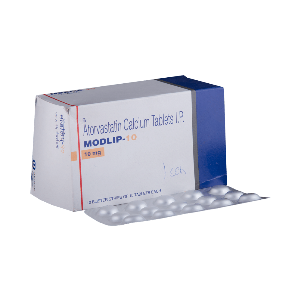 Modlip 10mg Tab (Atorvastatin) is a medication used to lower cholesterol levels. It works by blocking the production of cholesterol in the liver. It is important to take this medication exactly as prescribed by your doctor. Common side effects include muscle pain and weakness, headache, indigestion, constipation, diarrhea, and rash. If you experience any side effects, contact your doctor immediately. Avoid excessive alcohol consumption, and do not drive or operate machinery until you know how this medication affects you. Atorvastatin is not recommended for pregnant or breastfeeding women, and it is not usually prescribed for children. If you have kidney or liver problems, your doctor may need to monitor you closely.
