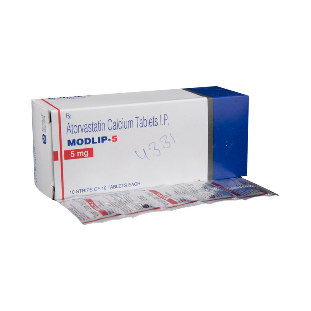 Modlip 5mg Tab (Atorvastatin) is a medication used to lower cholesterol levels in the blood. It can help reduce the risk of heart attack, stroke, and other heart-related problems. This medication is usually taken once a day, with or without food. It is crucial to follow your doctor's instructions carefully and report any unusual side effects. If you have any questions or concerns, please consult your doctor.