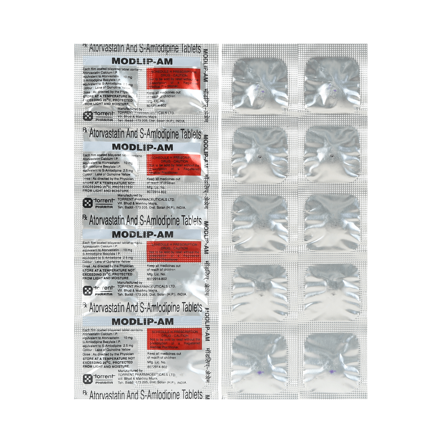Modlip Am Tab (Atorvastatin + S-Amlodipine) is a combination medication used to treat high cholesterol and high blood pressure. It works by lowering cholesterol and relaxing blood vessels. Dosage and safety are crucial; follow your doctor's instructions carefully and report any side effects immediately. The drug is not suitable for pregnant or breastfeeding women and may require dosage adjustments based on kidney and liver health. Always consult a physician before starting or stopping any medication.