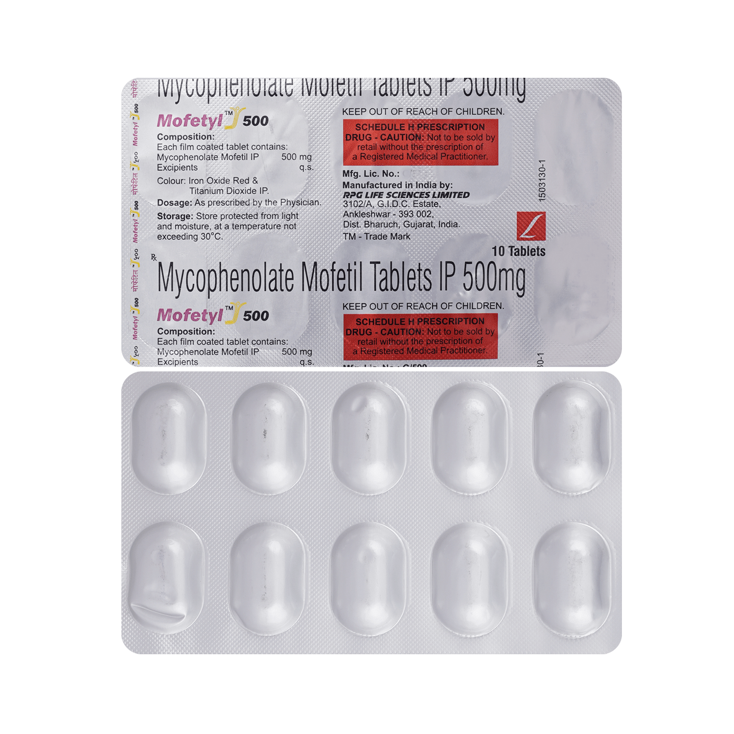 Mofetyl 500mg Tab (Mycophenolate Mofetil) (MMF) is an immunosuppressant medication used to prevent organ rejection after transplantation and to treat severe lupus nephritis. It works by suppressing the immune system. You should take MMF exactly as prescribed by your doctor. Common side effects include diarrhea, nausea, and headache. Serious side effects can occur, so it's important to contact your doctor immediately if you experience any concerning symptoms. MMF can cause drowsiness and dizziness, so avoid driving or operating machinery until you know how it affects you. Do not drink excessive alcohol while taking MMF, and avoid getting pregnant. It's important to discuss any pre-existing conditions with your doctor before starting this medication.