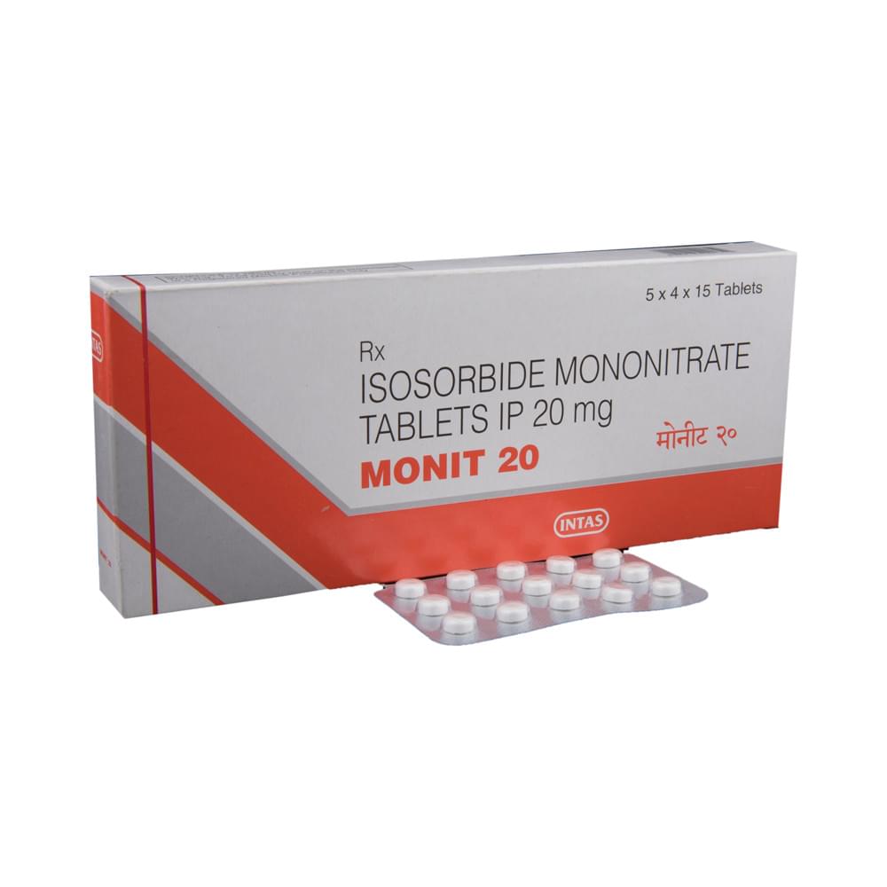 Monit 20mg Tab (Isosorbide Mononitrate) is a medication used to prevent and treat angina (chest pain). It works by widening blood vessels to improve blood flow to the heart. Common side effects include headache, dizziness, and lightheadedness. Always follow your doctor's instructions for dosage and administration. Inform your doctor of any other medications you are taking, including alcohol, and any pre-existing medical conditions, especially kidney or liver disease. If you experience severe side effects, seek immediate medical attention.