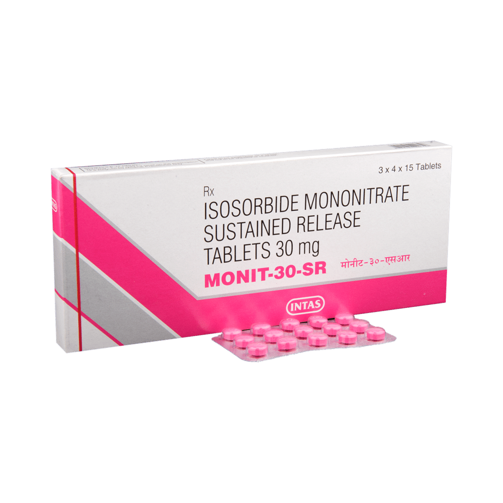 Monit Sr 30mg Tab (Isosorbide Mononitrate) is a medication used to prevent angina (chest pain) by relaxing blood vessels and improving blood flow to the heart. Common side effects include headache, dizziness, and lightheadedness. It's crucial to follow your doctor's prescribed dosage and inform them of any pre-existing conditions, especially kidney or liver problems. Alcohol consumption should be moderate, and driving or operating machinery should be approached with caution. Pregnant or breastfeeding women should consult their doctor before use.