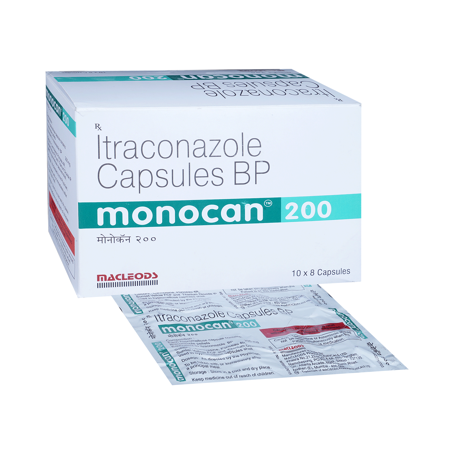 Monocan 200mg Cap (Itraconazole) is an antifungal medication used to treat various fungal infections. Dosage and duration of treatment vary depending on the infection. Common side effects include headache, nausea, and digestive issues. It's crucial to follow your doctor's instructions carefully, avoid alcohol, and report any unusual symptoms immediately.
