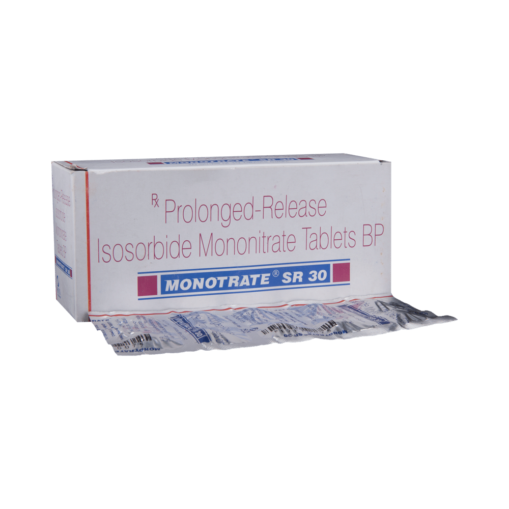 Monotrate Sr 30mg Tab (Isosorbide Mononitrate) is a medication used to prevent angina (chest pain) by relaxing blood vessels and improving blood flow to the heart. Common side effects include headache, dizziness, and lightheadedness. It's crucial to follow your doctor's prescribed dosage and inform them of any pre-existing conditions, especially kidney or liver problems. Alcohol consumption should be moderate, and driving or operating machinery should be approached with caution. Pregnant or breastfeeding women should consult their doctor before use.
