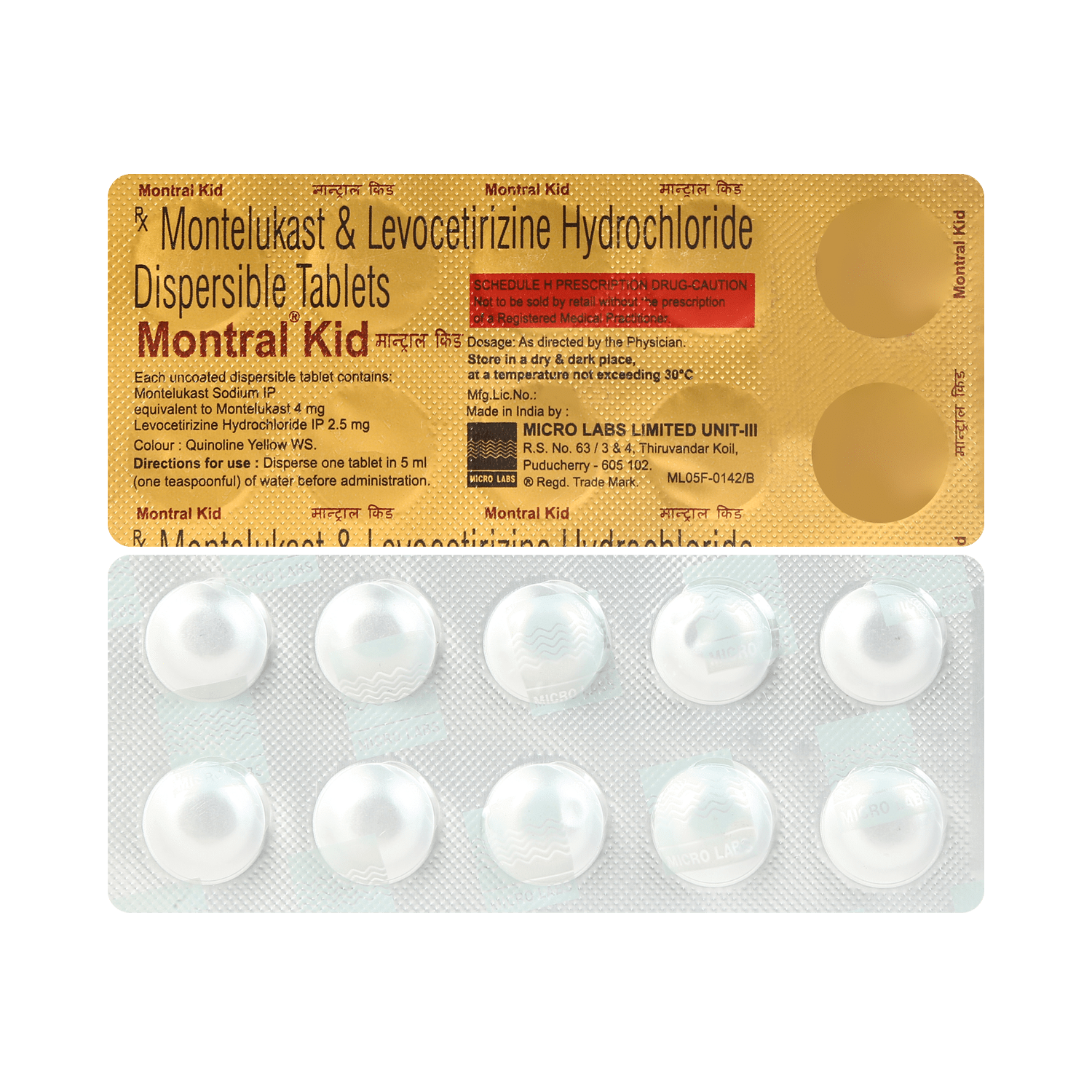 This combination medication contains Montral Kid Tab (Levocetirizine + Montelukast), used to relieve allergic rhinitis and chronic urticaria symptoms. Levocetirizine blocks histamine, while montelukast blocks leukotrienes, reducing inflammation. Common side effects include drowsiness and headache. Consult your doctor before use, particularly if pregnant, breastfeeding, or have kidney/liver issues. Do not operate machinery if drowsy. Always follow prescribed dosage.