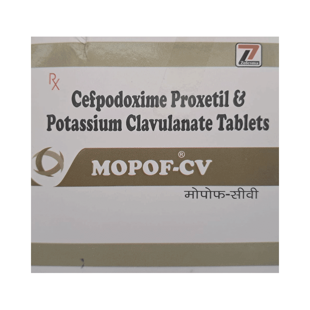 Mopof-Cv Tablet (Cefpodoxime Proxetil + Clavulanic Acid) is an antibiotic combination used to treat various bacterial infections. Always follow your doctor's instructions regarding dosage and duration of treatment. Report any side effects immediately. This medication may interact with other drugs and alcohol; consult your doctor about any potential interactions or health concerns.