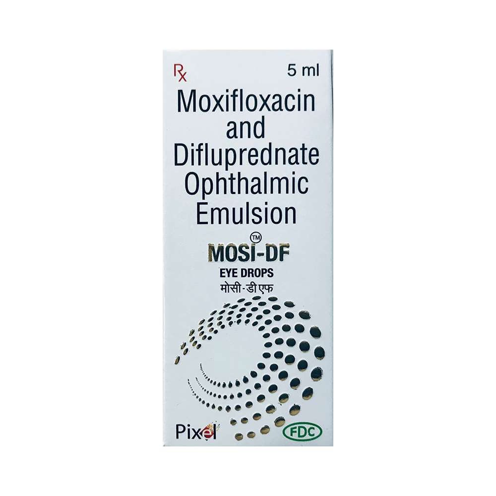 Mosi Df Eye Drops 5ml (Moxifloxacin + Difluprednate) eye drops are a combination medication used to treat bacterial conjunctivitis (pink eye) in adults when the infection is severe or does not respond to other treatments. It is also used to treat inflammation and infection associated with post-operative inflammation following cataract surgery. This medication works by killing bacteria (Moxifloxacin) and reducing inflammation (Difluprednate). The most common side effects include eye irritation, burning, stinging, or dryness. It is important to consult your doctor before using this medication if you are pregnant, breastfeeding, have kidney or liver problems, or are taking other medications. This medication may cause blurred vision, so avoid driving or operating machinery until your vision is clear. Store the medication at room temperature, away from direct sunlight and moisture.