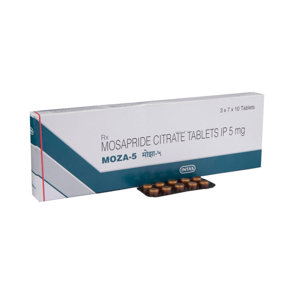 Moza 5mg Tab (Mosapride) is a medication used to treat symptoms of gastroparesis, a condition where the stomach empties slowly. It works by increasing the activity of a natural substance in the body called acetylcholine, which helps to stimulate the muscles in the stomach and intestines. Mosapride is usually taken by mouth with a glass of water and can be taken with or without food. Common side effects include headache, diarrhea, and abdominal pain. It is important to talk to your doctor about any potential risks or side effects before taking mosapride.