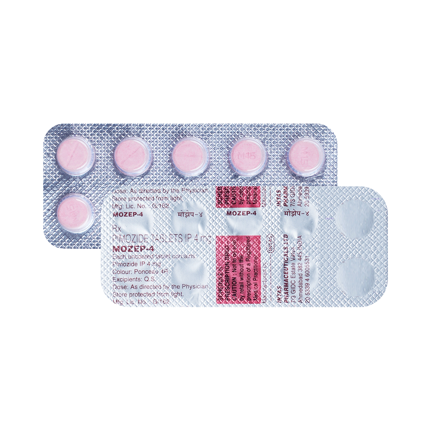 Mozep 4mg Tab (Pimozide) is a medication used to treat Tourette's syndrome and severe cases of chronic schizophrenia in adults. It works by blocking the action of dopamine in the brain. It is important to take pimozide exactly as prescribed by your doctor. Common side effects include drowsiness, dizziness, dry mouth, and constipation. More serious side effects can occur, so it is important to discuss any concerns with your doctor.