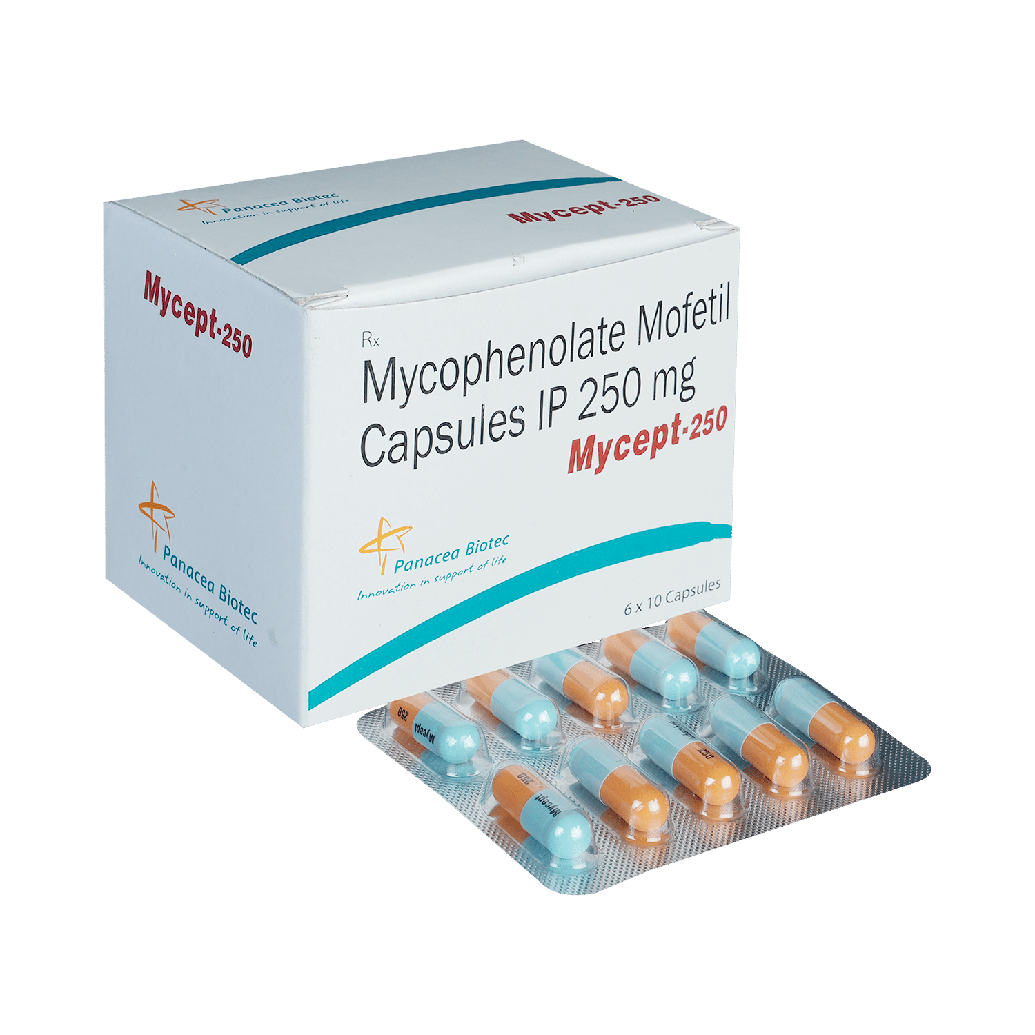 Mycept 250mg Cap (Mycophenolate Mofetil) (MMF) is an immunosuppressant drug primarily used to prevent organ rejection after transplantation. Its effectiveness relies on inhibiting immune cell replication. While highly effective, it can cause various side effects ranging from mild to severe. Strict adherence to prescribed dosage, regular monitoring by your healthcare provider, and prompt reporting of any adverse effects are crucial for safe and effective treatment. MMF is teratogenic; pregnancy must be avoided.
