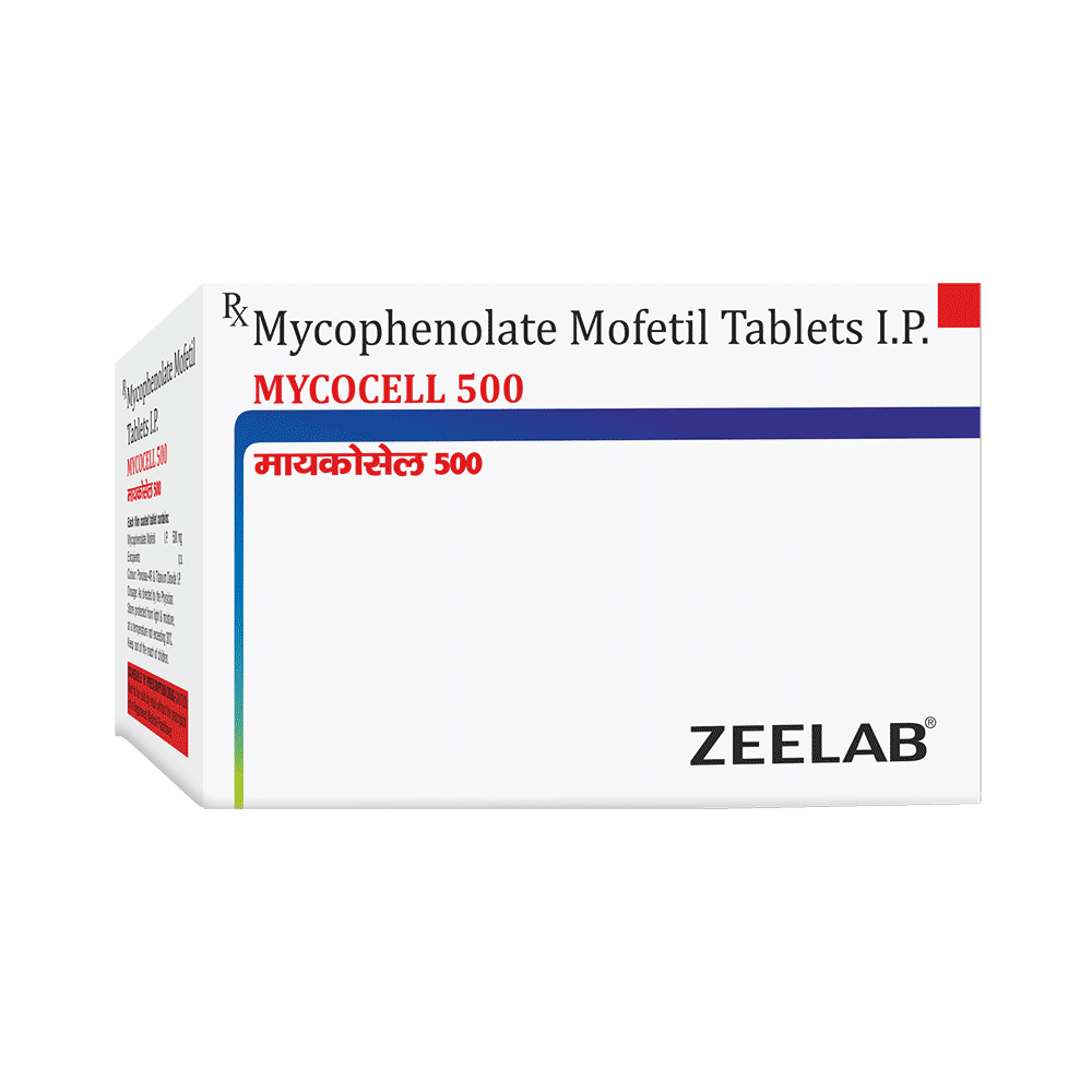 Mycocell 500 Tablet (Mycophenolate Mofetil) (MMF) is an immunosuppressant medication used to prevent organ rejection after transplantation and to treat severe lupus nephritis. It works by suppressing the immune system. You should take MMF exactly as prescribed by your doctor. Common side effects include diarrhea, nausea, and headache. Serious side effects can occur, so it's important to contact your doctor immediately if you experience any concerning symptoms. MMF can cause drowsiness and dizziness, so avoid driving or operating machinery until you know how it affects you. Do not drink excessive alcohol while taking MMF, and avoid getting pregnant. It's important to discuss any pre-existing conditions with your doctor before starting this medication.