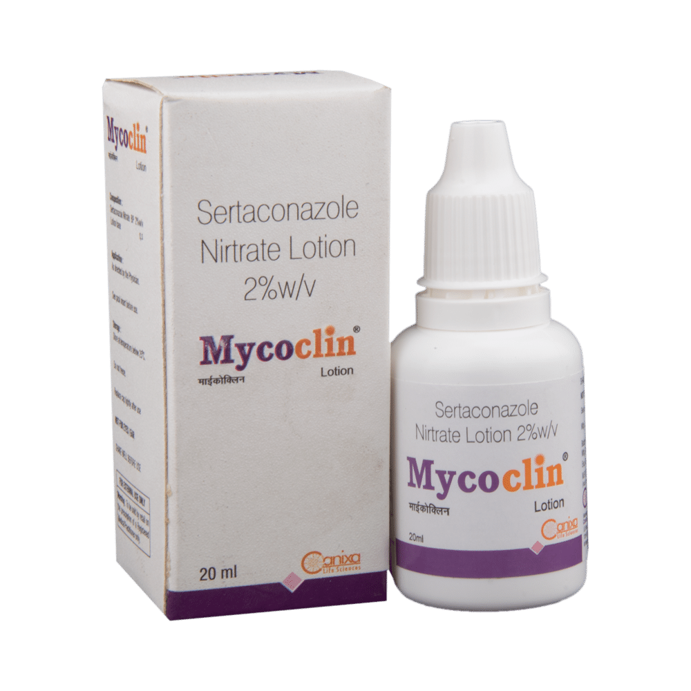 Mycoclin Lotion 20ml (Sertaconazole) is a topical antifungal medication used to treat fungal infections of the skin. It works by inhibiting the growth of fungi. Common side effects include skin irritation, redness, dryness, or burning. Consult your doctor if you have any concerns or experience any unusual symptoms.