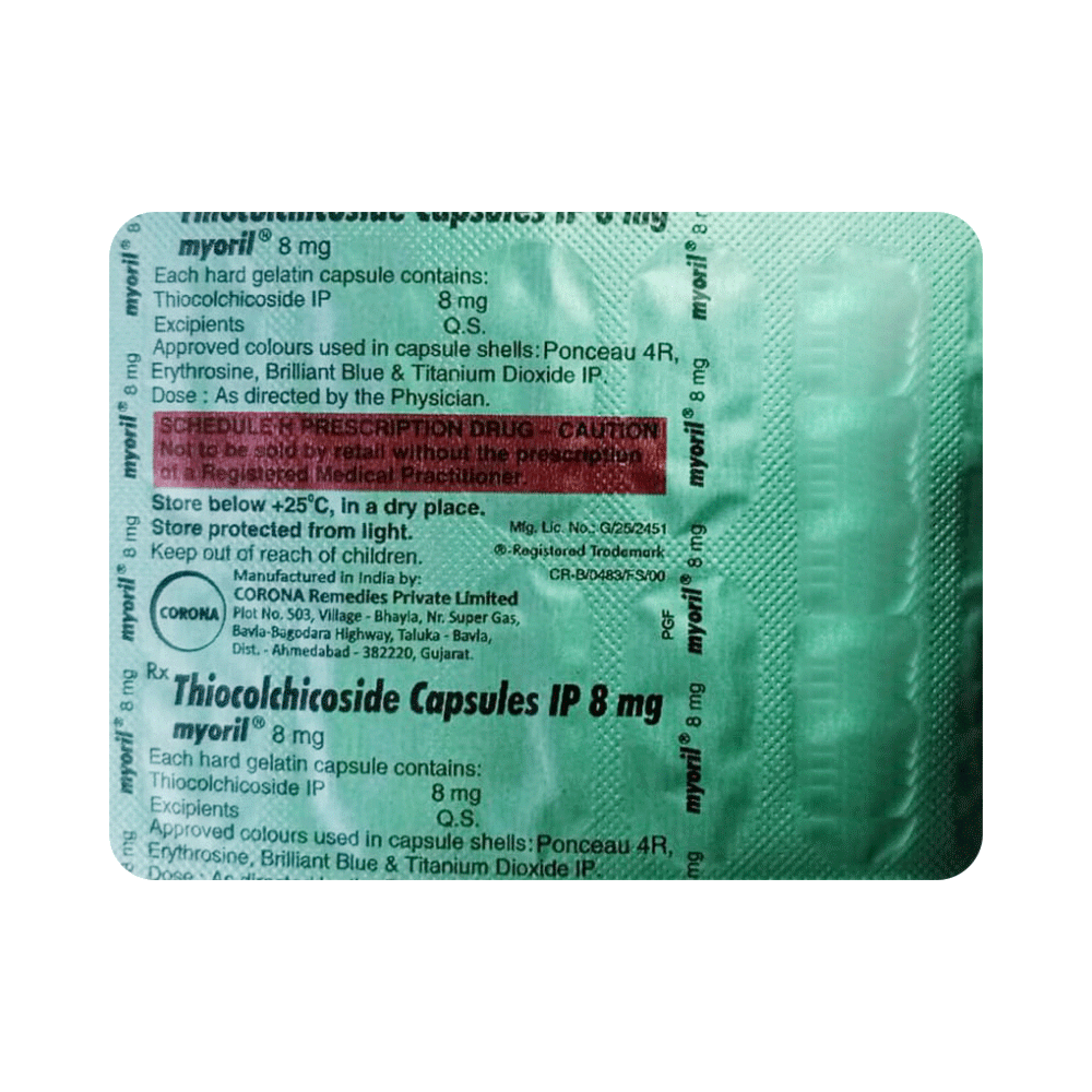 Myoril 8mg Cap (Thiocolchicoside) is a muscle relaxant used to relieve pain and inflammation associated with musculoskeletal conditions. It works by reducing muscle spasms. Common side effects include gastrointestinal upset and drowsiness. Alcohol should be avoided. Driving and operating machinery may be impaired. Pregnant and breastfeeding women should consult their doctor. This medication should be used as prescribed by a physician.