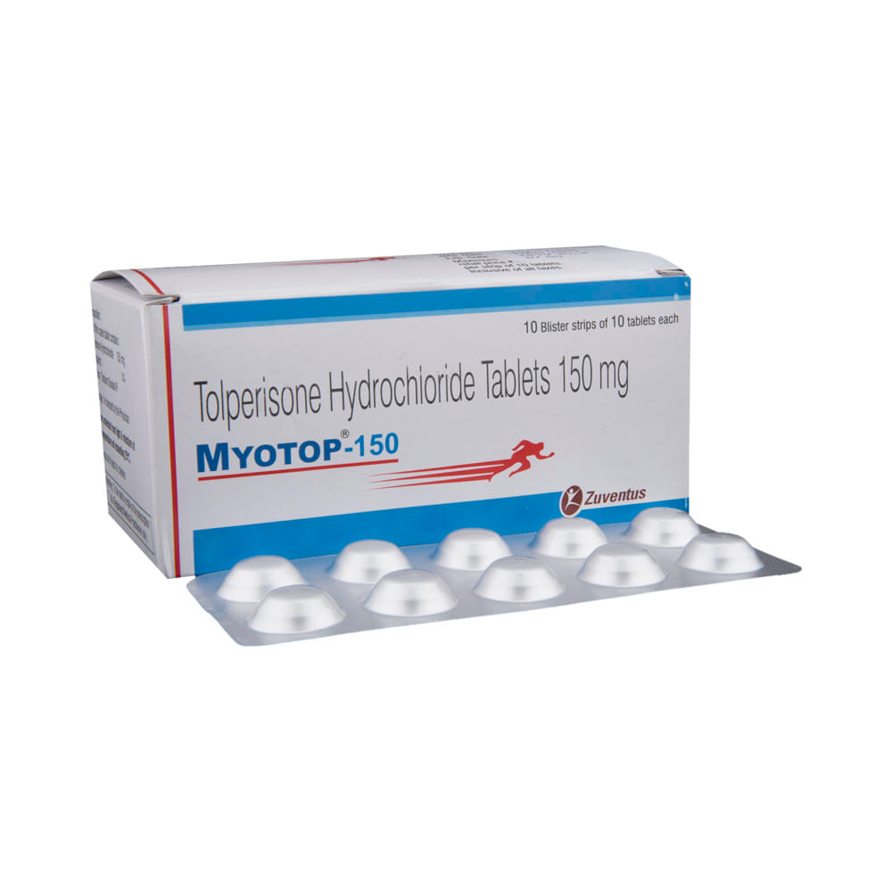Myotop 150 Tab (Tolperisone) is a medication used to treat muscle spasms and stiffness. It works by relaxing the muscles. The dosage and duration of treatment will depend on your individual condition and response to the medication. Common side effects include drowsiness, fatigue, dizziness, headache, nausea, vomiting, constipation, and dry mouth. Avoid alcohol and driving while taking this medication. It is not recommended for children under 12 years of age, pregnant women, or breastfeeding women. If you have kidney or liver problems, discuss it with your healthcare provider before taking Tolperisone.