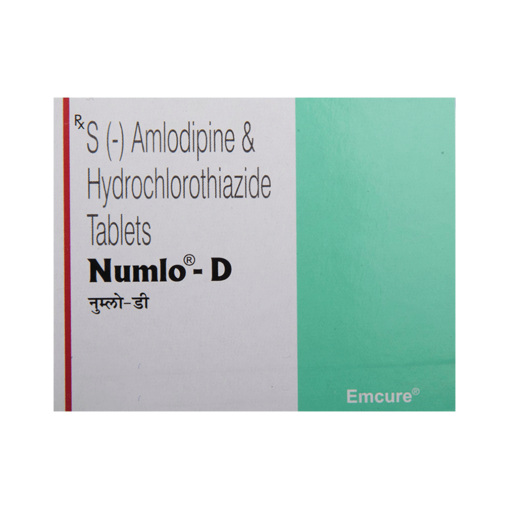 Numlo D 5mg Tab (Amlodipine + Hydrochlorothiazide) is a combination medication used to treat high blood pressure. It works by relaxing blood vessels and reducing fluid retention. This medication is typically taken once daily. Common side effects include headache, dizziness, and swelling in the ankles or feet. Important safety considerations include avoiding alcohol consumption, being cautious while driving or operating machinery, and consulting your doctor if you are pregnant, breastfeeding, or have kidney or liver problems.