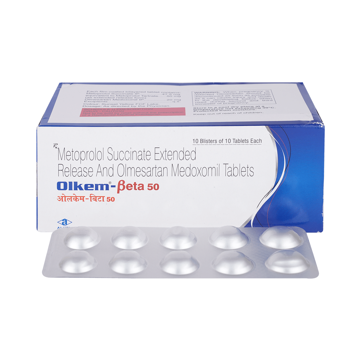 Olkem Beta 50mg Tab (Metoprolol + Olmesartan Medoxomil) is a combination medication used to treat high blood pressure and other cardiovascular problems. It works by reducing the workload of the heart and improving blood flow. This medication is usually taken once daily, with or without food. Common side effects include dizziness, lightheadedness, fatigue, headache, and cough. Serious side effects can include angioedema (swelling of the face, lips, tongue, or throat), low blood pressure, slow heart rate, and kidney problems. If you experience any unusual or severe side effects, contact your doctor immediately. This medication is not recommended for use during pregnancy or breastfeeding. It is important to take this medication exactly as prescribed by your doctor. Do not stop taking this medication without talking to your doctor.