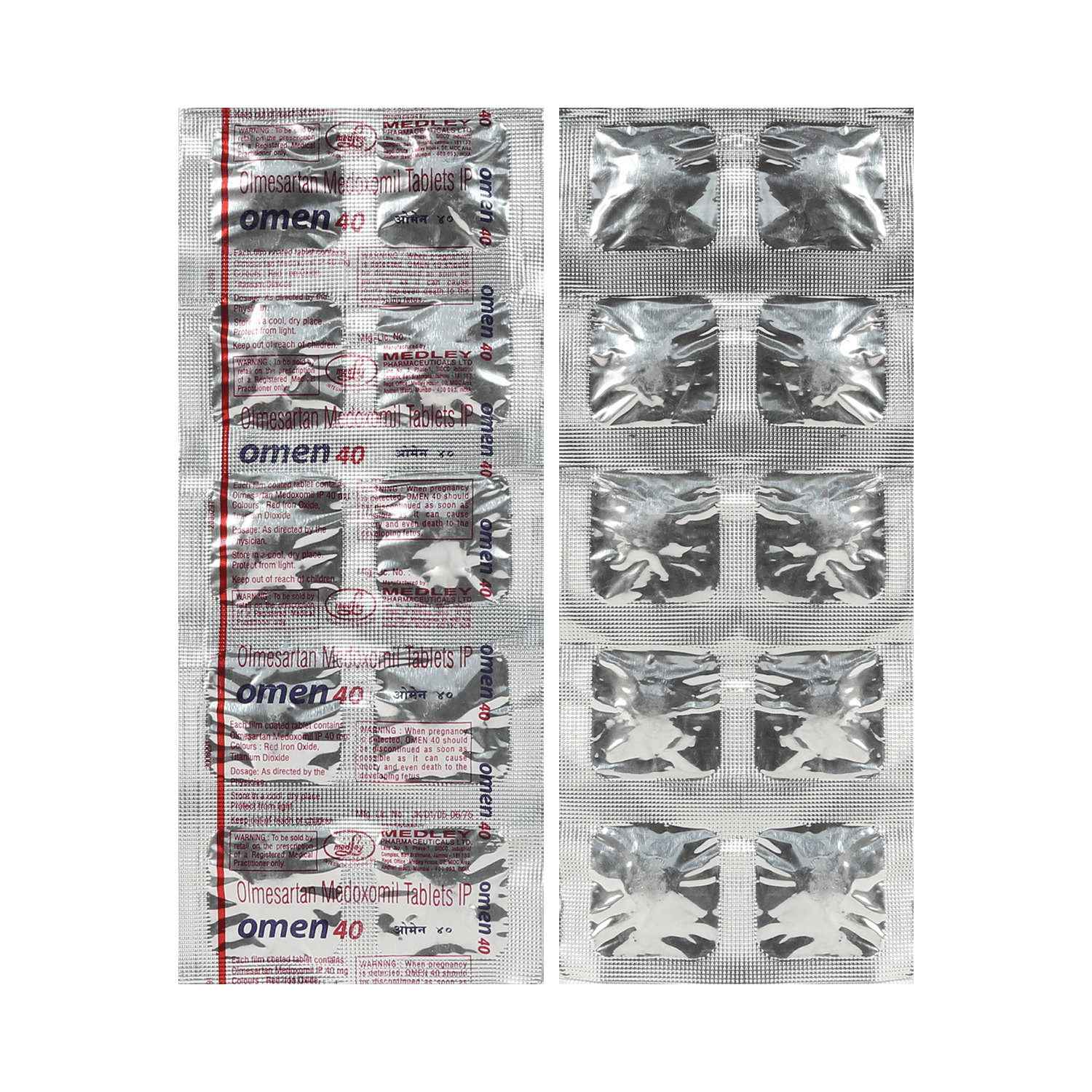 Omen 40mg Tab (Olmesartan Medoxomil) is a medication used to treat high blood pressure and to reduce the risk of stroke in high-risk patients. It works by relaxing blood vessels and lowering blood pressure. This medication is generally safe and effective, but it can cause some side effects. It's important to take it as prescribed by your doctor and to inform them about any pre-existing health conditions or medications you're taking.