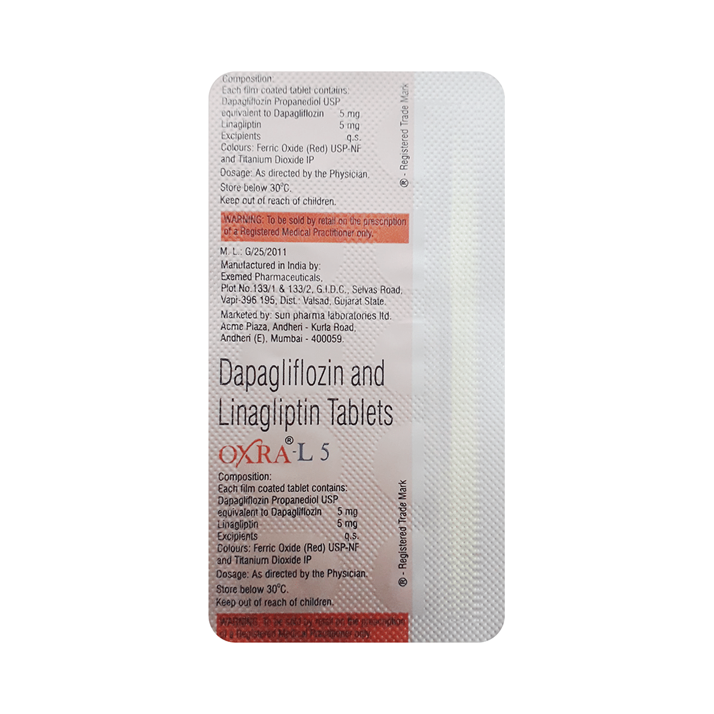 Oxra L 5 Tab (Dapagliflozin + Linagliptin) is a combination medication used to manage type 2 diabetes. It works by improving how your body handles blood sugar. Common side effects include increased urination and infections. It's crucial to discuss this medication with your doctor to determine the appropriate dosage and address any concerns regarding potential side effects or interactions with other medications. Do not drive or operate machinery if you feel dizzy or lightheaded. Follow your doctor's instructions carefully.