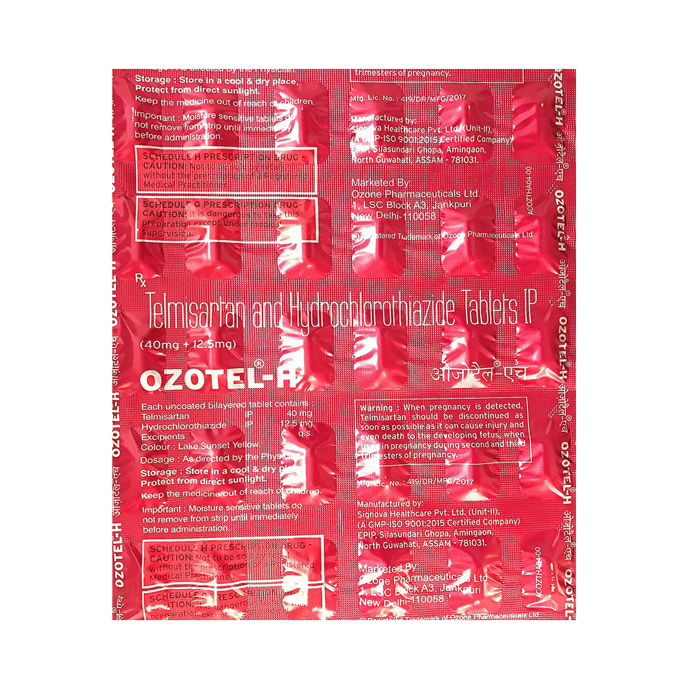 Ozotel H 40mg Tab (Hydrochlorothiazide + Telmisartan) is a combination medication used to treat high blood pressure and reduce the risk of stroke in people with certain heart conditions. It works by relaxing blood vessels and decreasing the amount of fluid in your body. This medication is typically taken once daily, with or without food. Common side effects include dizziness, headache, and fatigue. It's important to avoid alcohol while taking this medication and to be cautious when driving or operating machinery. If you experience any unusual side effects, seek medical attention immediately.