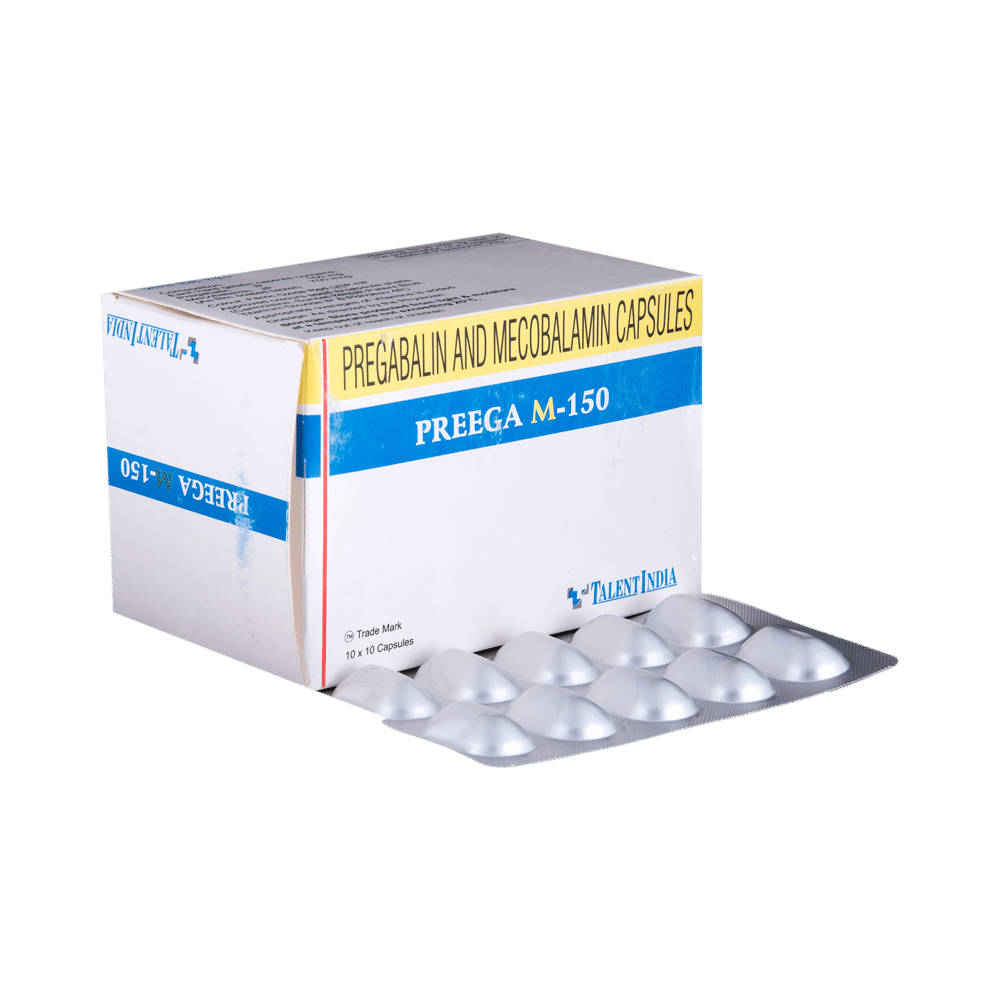 Preega M 150mg Cap (Methylcobalamin + Pregabalin) is a combination medication used to treat nerve pain, anxiety, and seizures. It works by repairing and maintaining nerve function and reducing pain signals in the brain. Potential side effects include dizziness, sleepiness, and weight gain. It is important to follow your doctor's instructions carefully and discuss any concerns you have about the medication.
