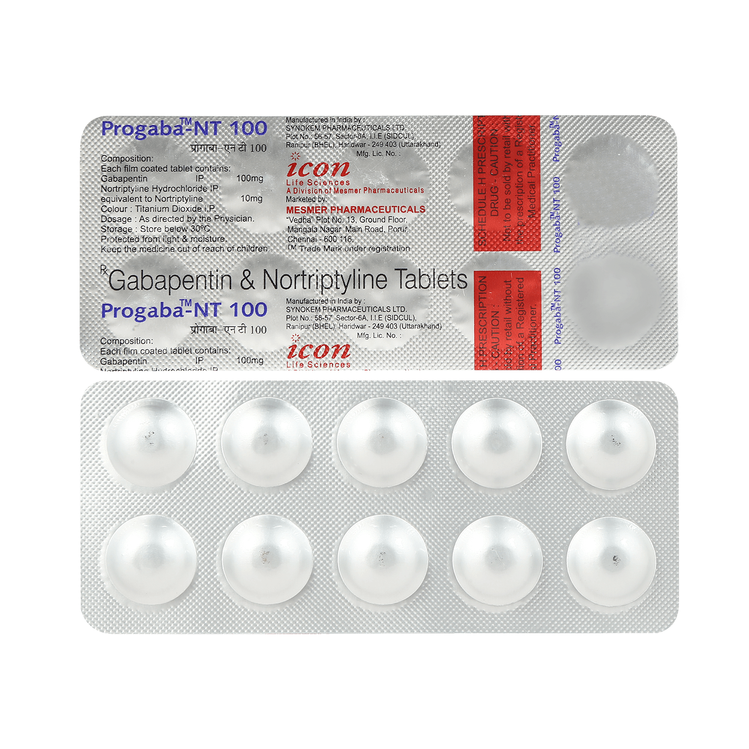 Progaba Nt 100mg Tab (Gabapentin + Nortriptyline) are medications used to treat neuropathic pain, restless legs syndrome, and fibromyalgia. They work by influencing nerve activity and neurotransmitter levels. It is important to follow your doctor's instructions carefully, store the medication properly, and be aware of potential side effects. This medication may interact with alcohol and other medications. It's crucial to inform your doctor about any health conditions, allergies, or medications you're taking. This medication is not approved for use in children and may pose risks for pregnant and breastfeeding women. If you experience any adverse effects, contact your doctor immediately.