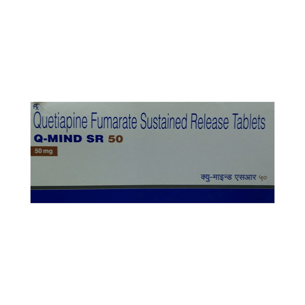 Q Mind Sr 50mg Tab (Quetiapine) is an antipsychotic medication prescribed for various conditions such as schizophrenia, bipolar disorder, and major depressive disorder. It works by influencing brain chemicals like dopamine and serotonin. The medication is typically taken orally once or twice daily, and its dosage is individualized. Potential side effects include drowsiness, dizziness, weight gain, and various other side effects. It is crucial to avoid alcohol consumption while taking quetiapine and be cautious while driving or operating machinery due to potential drowsiness. Consult your doctor about the risks and benefits if you are pregnant, breastfeeding, have kidney or liver problems, or are under 13 years old. Always follow your doctor's instructions regarding dosage, frequency, and duration of treatment.
