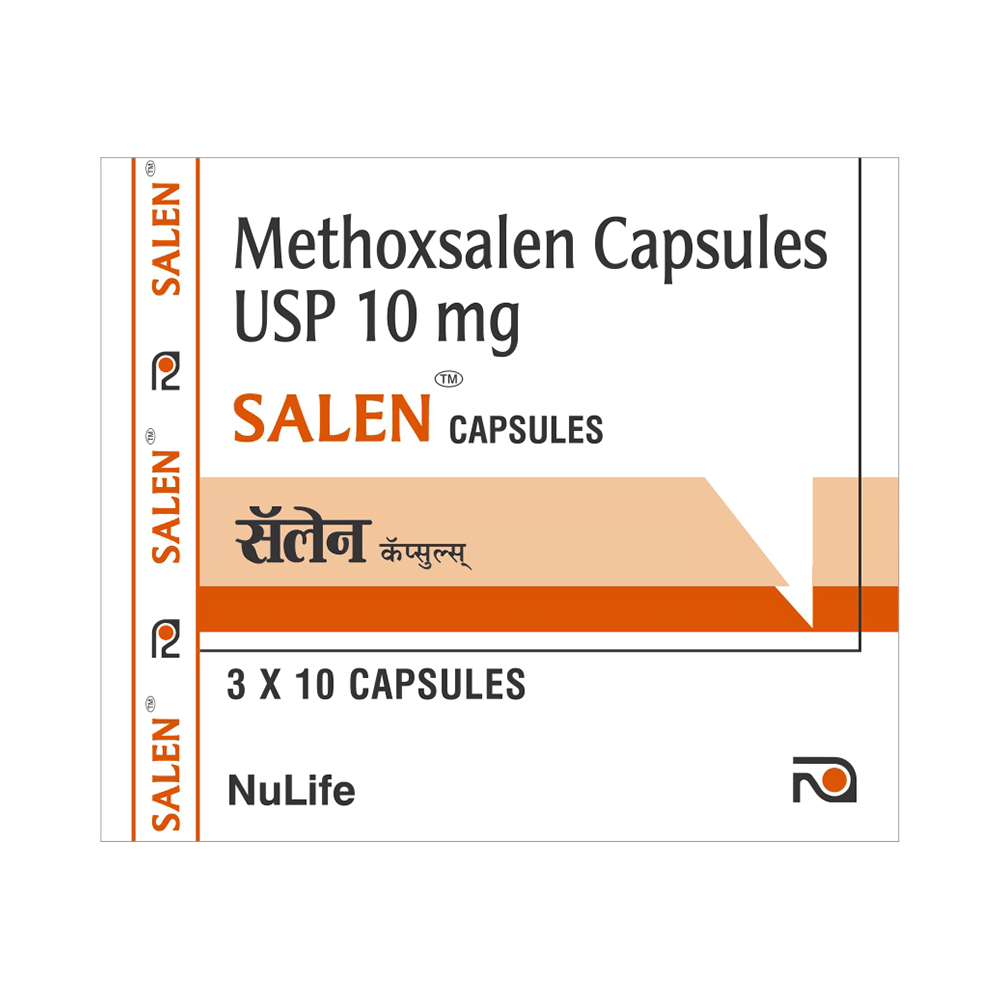 Salen 10mg Cap (Methoxsalen) is a medication used in combination with UV light therapy (PUVA therapy) to treat certain skin conditions. It increases the skin's sensitivity to UV light, helping to slow down the growth of skin cells and reduce inflammation. It's important to use methoxsalen as directed by your doctor and to be aware of potential side effects. You should also avoid alcohol and be cautious while driving or operating machinery. Pregnant and breastfeeding women should not use methoxsalen.