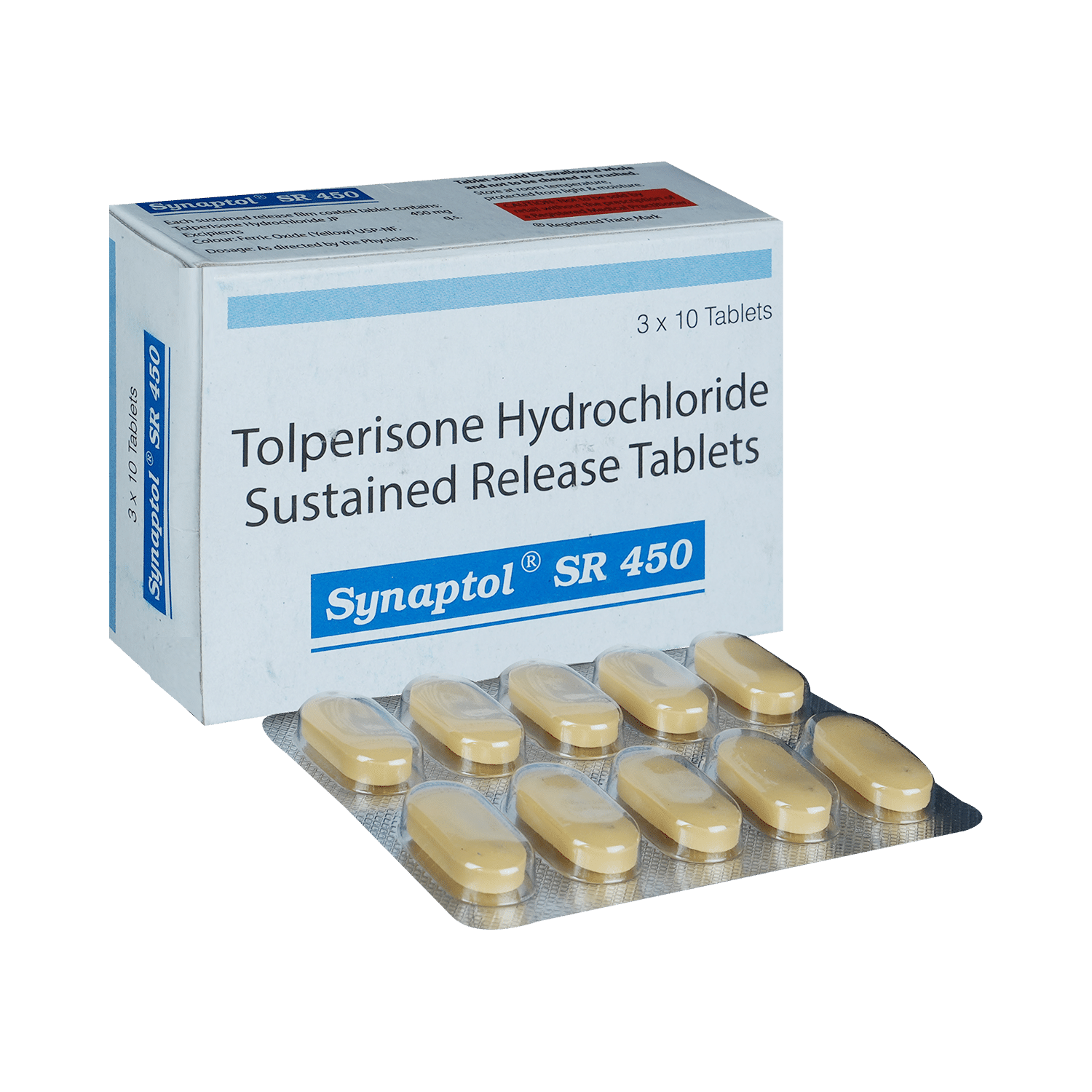 Synaptol Sr 450mg Tab (Tolperisone) is a muscle relaxant used to treat muscle spasms and pain. While generally safe, it can cause side effects like drowsiness and dizziness. It’s crucial to follow your doctor's prescribed dosage and avoid alcohol and operating machinery while taking it. Consult your doctor before use if pregnant, breastfeeding, or have kidney/liver problems.