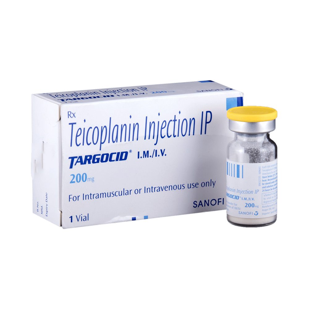 Targocid 200mg Inj (Teicoplanin) is a powerful antibiotic used to treat serious bacterial infections. It works by preventing the bacteria from forming their protective cell wall. It is usually administered through an IV infusion, but may also be given as an injection. While effective, teicoplanin can cause side effects, some of which can be serious. It is crucial to follow your doctor's instructions precisely and to notify them about any side effects you experience. Ensure you discuss potential risks and benefits with your doctor, especially if you are pregnant, breastfeeding, have kidney or liver problems, or are taking other medications.