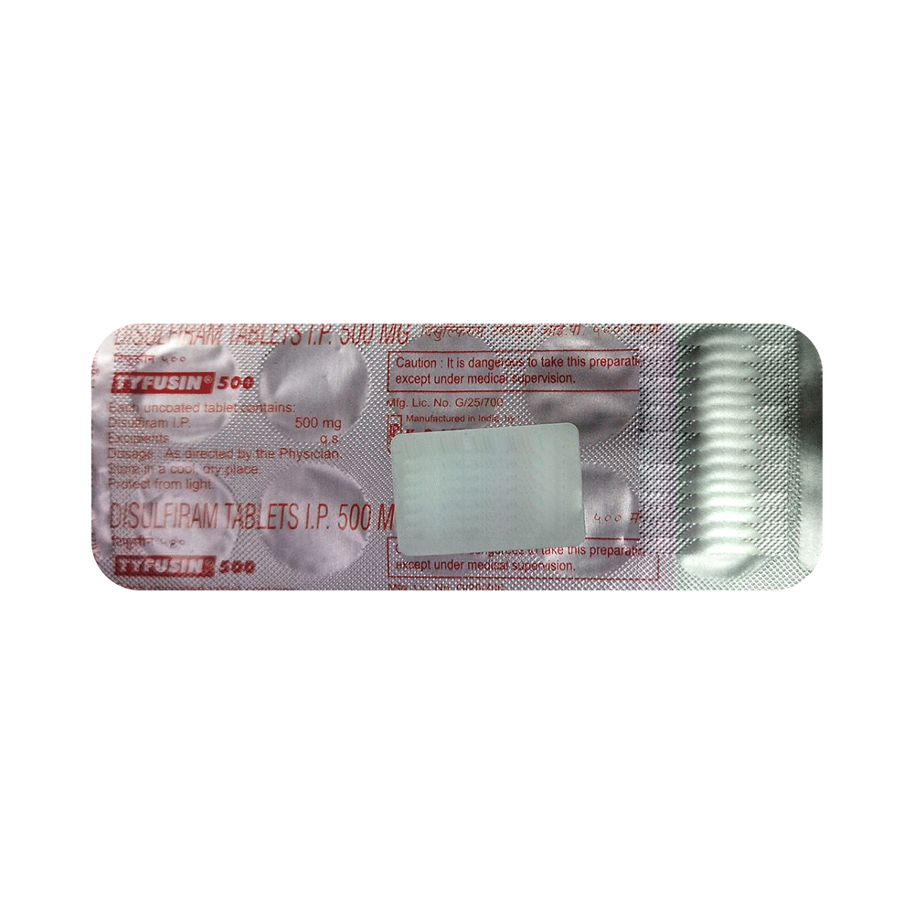 Tyfusin 500mg Tab (Disulfiram) is a medication used to help people with alcohol use disorder avoid drinking by making them feel sick if they consume alcohol. It works by blocking the enzyme that breaks down alcohol in the body. It is important to follow your doctor's instructions carefully, avoid alcohol completely while taking disulfiram, and be aware of potential side effects.
